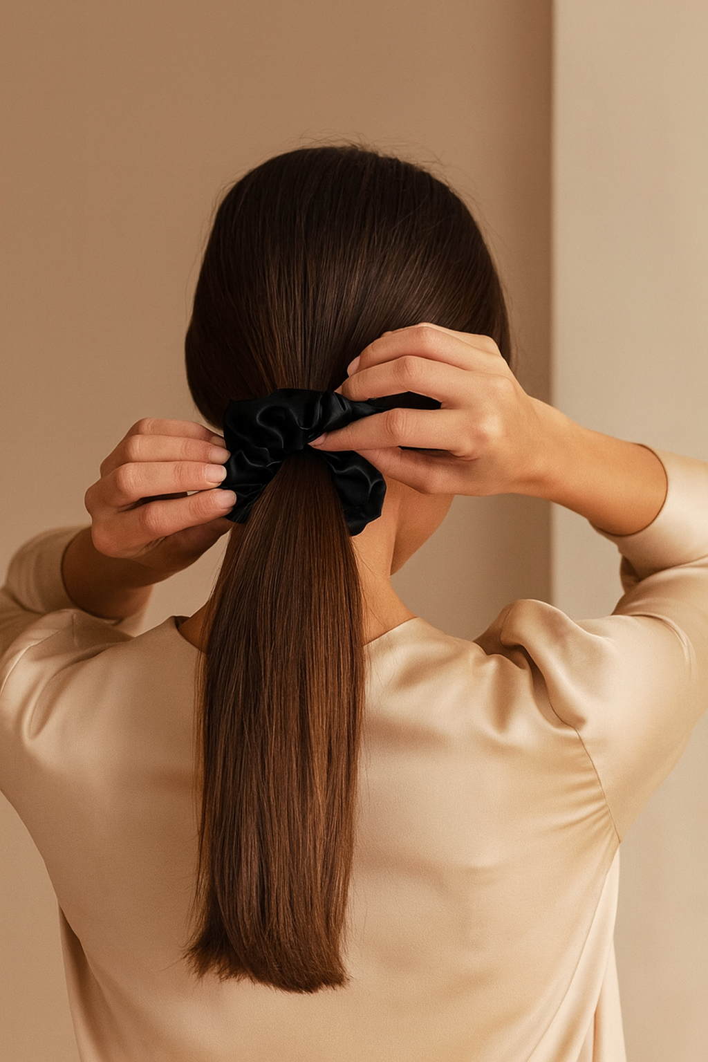Porter un chouchou en soie, c’est offrir à ses cheveux un véritable traitement de faveur. La soie de mûrier glisse sans accrocher, limite les frottements et protège la fibre au lieu de la casser. Résultat : une attache confortable qui ne marque pas les cheveux et préserve leur douceur naturelle, même après plusieurs heures.